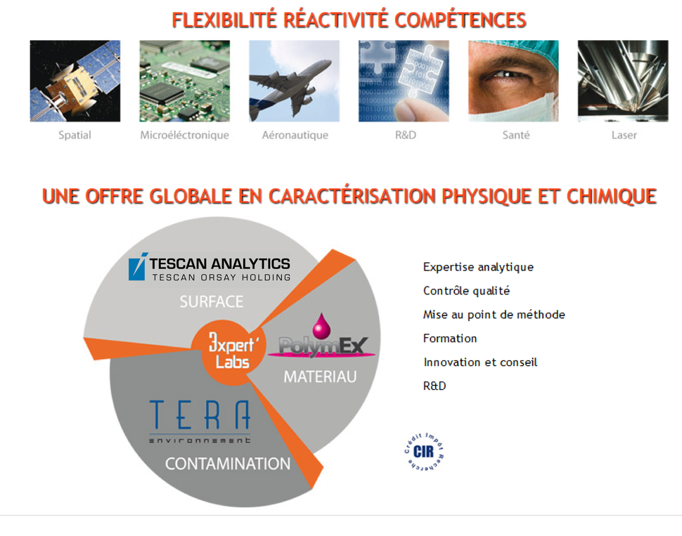 Trois sociétés sont à l’origine de la marque Expert’Labs : TERA Environnement, Biophy Research aujourd’hui TESCAN ANALYTICS et POLYMEX : elles proposent aux industriels leurs expertises complémentaires en caractérisation des matériaux et en analyse des surfaces et des contaminants chimiques :